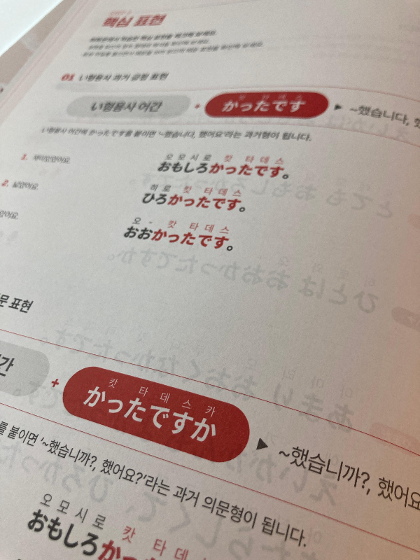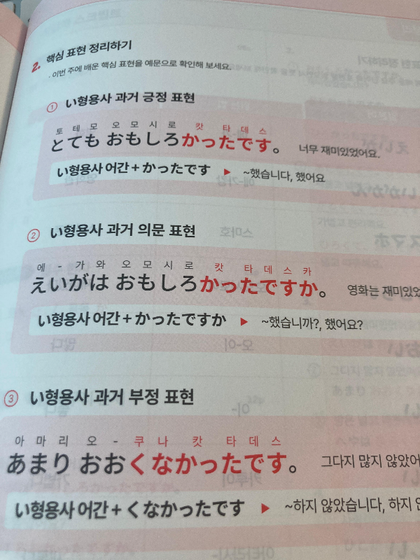 - 과거 긍정 표현 : [い형용사 어간] + [かったです] (~했습니다, 했어요)